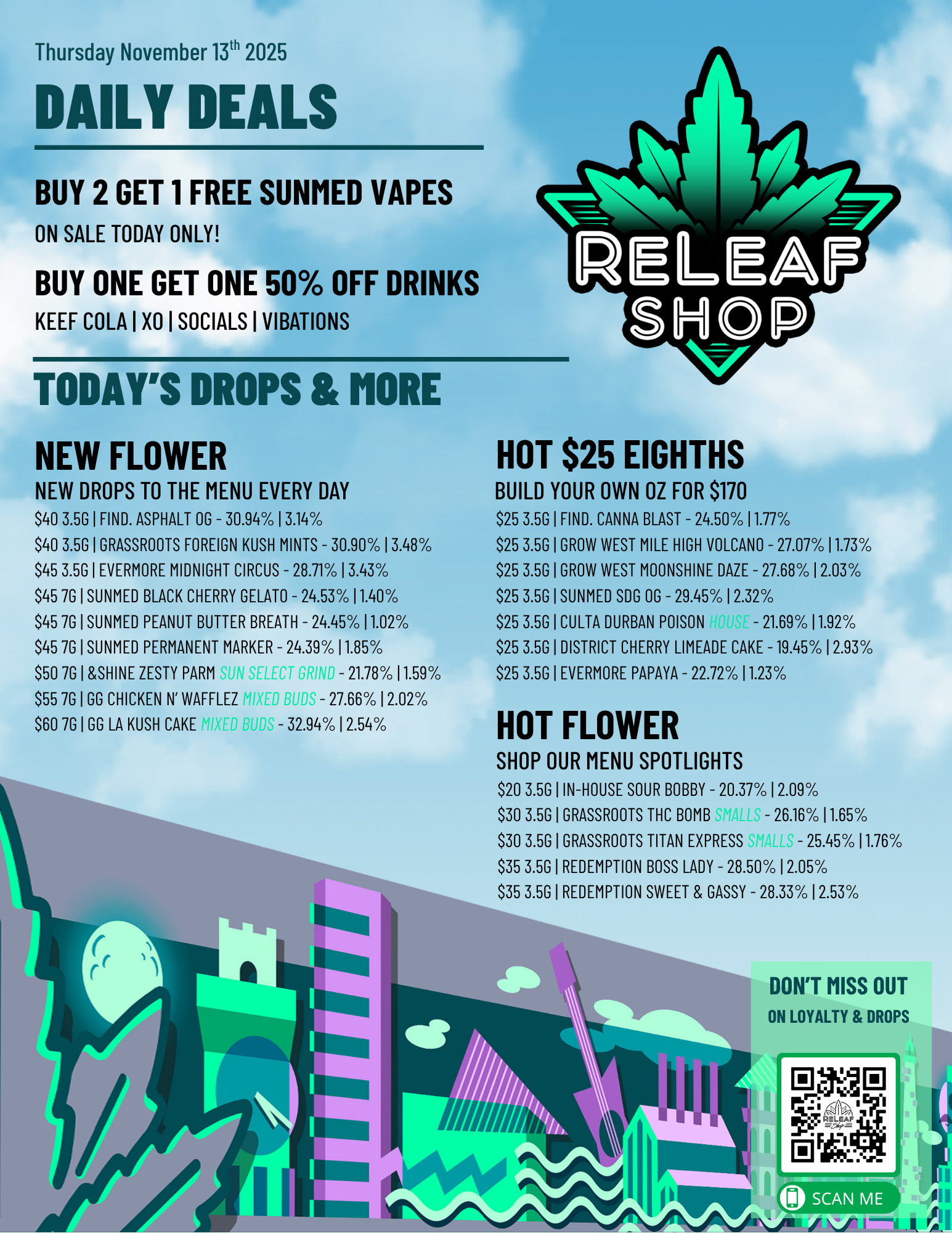 At ReLeaf Shop Baltimore, we believe that high-quality cannabis should be accessible and affordable for everyone. That’s why we offer amazing daily deals and exclusive discounts on the best flower, edibles, vapes, concentrates, pre-rolls, and more! Whether you're a medical patient or recreational user, we’ve got rotating specials and unbeatable prices on the cannabis products you love.